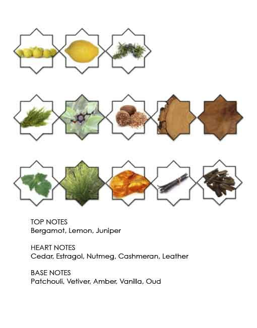 Base Notes: Patchouli, Vetiver, Amber, Vanilla, Oud