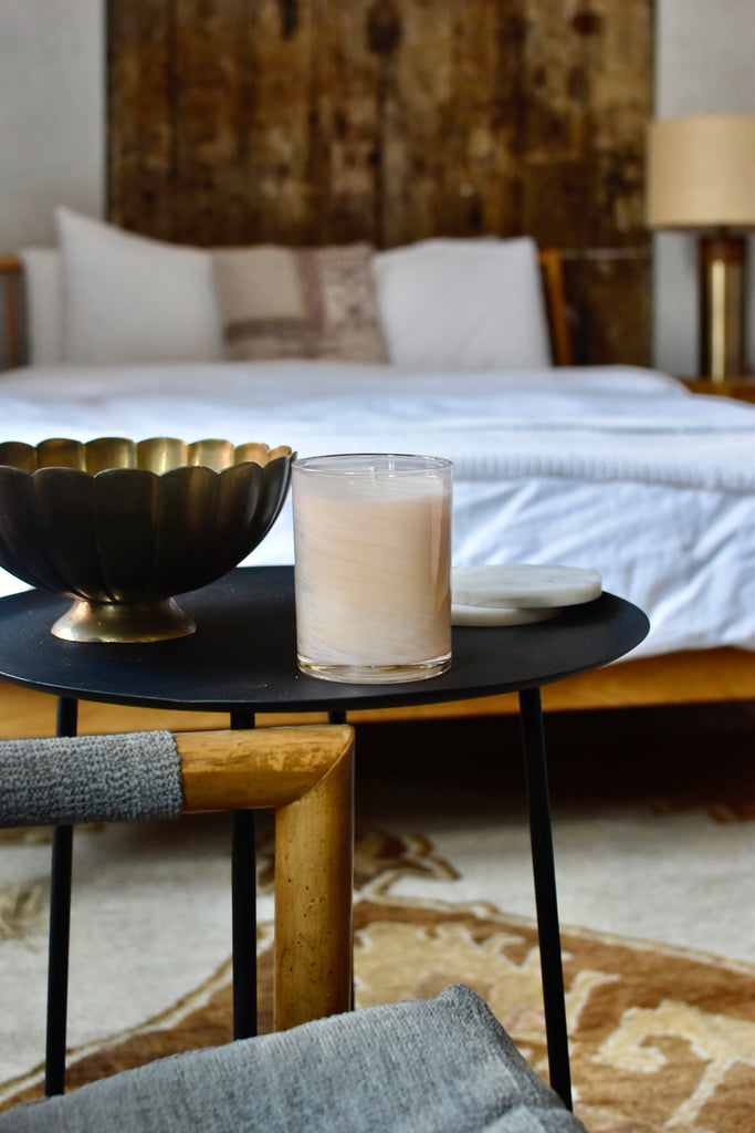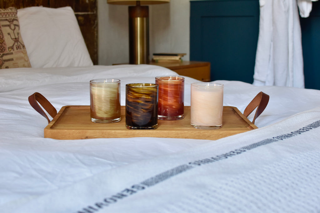 Each piece is hand-poured by GP Candle Co. into a hand-blown glass vessel crafted by Dustin Scarfpin of Bambino Glassware, creating a work of scent and design made to be cherished long after the last burn.